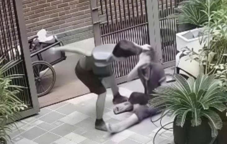 Clip ghi lại cảnh người chồng đánh vợ ngay ngoài cổng - Ảnh cắt từ clip