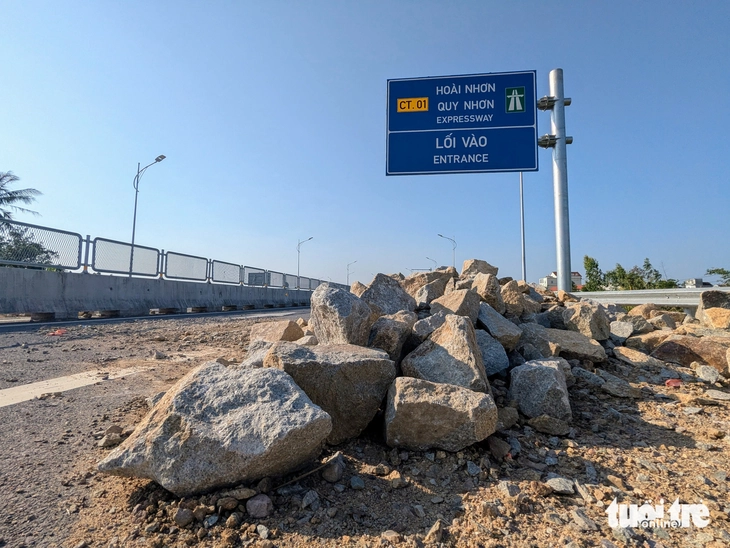 Lối vào đường cao tốc Hoài Nhơn - Quy Nhơn được đổ đá chặn lại vì chưa đưa vào khai thác - Ảnh: TẤN LỰC