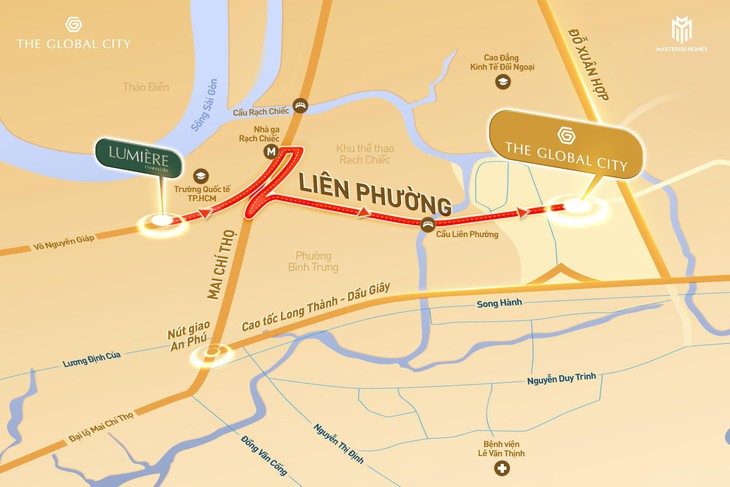 Từ ngã tư Đỗ Xuân Hợp, tuyến đường xuyên tâm qua The Global City, kết nối trực tiếp đến Khu liên hợp thể thao Rạch Chiếc và đại lộ Mai Chí Thọ, giúp hành trình di chuyển trở nên chủ động và rút ngắn đáng kể.