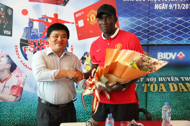 | Ông Lê Thế Chữ - phó tổng biên tập báo Tuổi Trẻ tặng hoa cho Dwight Yorke - Ảnh: T.P. |