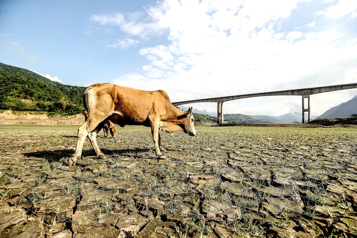 Lòng hồ thủy điện Sơn La (khu vực Mường Lay, tỉnh Điện Biên) cạn trơ đáy, nứt nẻ năm 2023 - Ảnh: NGUYỄN KHÁNH