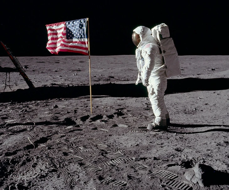 Phi công đứng cạnh quốc kỳ Mỹ trong chuyến đổ bộ lên Mặt trăng của tàu Apollo 11 năm 1969 - Ảnh: NASA