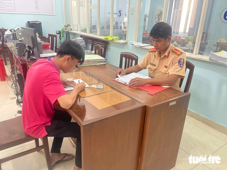 Lực lượng CSGT lập biên bản xử lý vi phạm với T. - Ảnh: HOÀI THƯƠNG