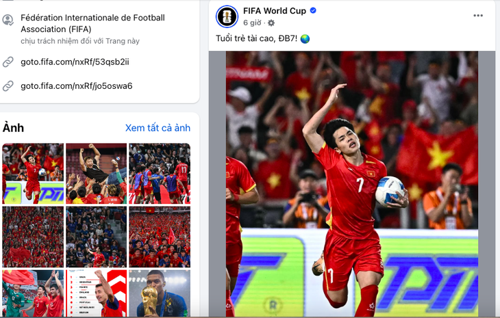 Cụ thể, trang FIFA World Cup chọn hình ảnh Đình Bắc ăn mừng bàn thắng rút ngắn tỉ số 1-2 trong trận chung kết bóng đá nam SEA Games 33 để đăng tải cùng dòng trạng thái được viết bằng tiếng Việt: "Tuổi trẻ tài cao, ĐB7 (Đình Bắc 7 - PV)!".