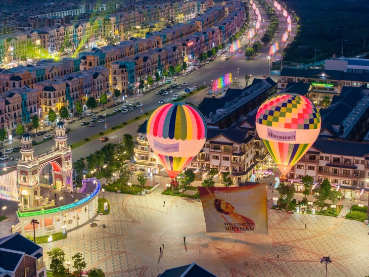 Ngay từ chiều 5-10, quảng trường K-Town (Vinhomes Ocean Park) bỗng trở thành tâm điểm khi hai chiếc khinh khí cầu rực rỡ bay lên mang theo banner "Übermensch - Welcome to Vietnam" và hình ảnh G-DRAGON nổi bật giữa trời thu.
