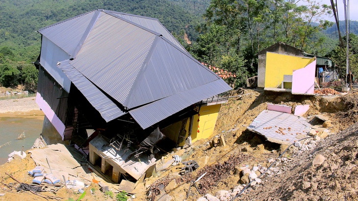 Ngôi nhà của gia đình chị Hà Thị Điều, ở bản Din, xã Trung Hạ, tỉnh Thanh Hóa, bị mưa lũ làm đổ sập xuống sông Lò - Ảnh: HÀ ĐỒNG