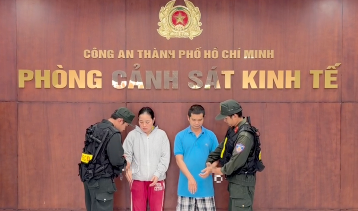 Công an TP.HCM thi hành lệnh bắt vợ chồng Nguyễn Thị Mỹ Phụng do tổ chức sản xuất mì chứa chất cấm - Ảnh: Công an TP.HCM