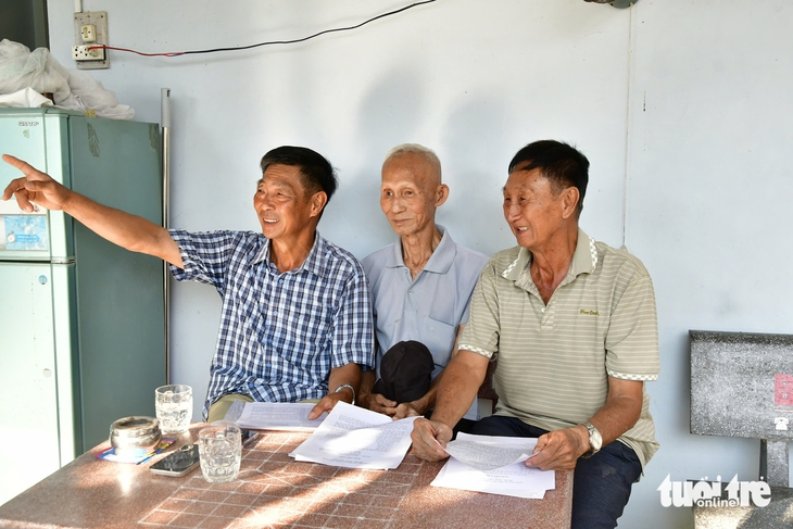 Ông Đỗ Văn Bảy (bìa trái) và người dân trong ấp xem lại những lá đơn yêu cầu, kiến nghị từ năm 2016 đến nay - Ảnh: MINH HỔ