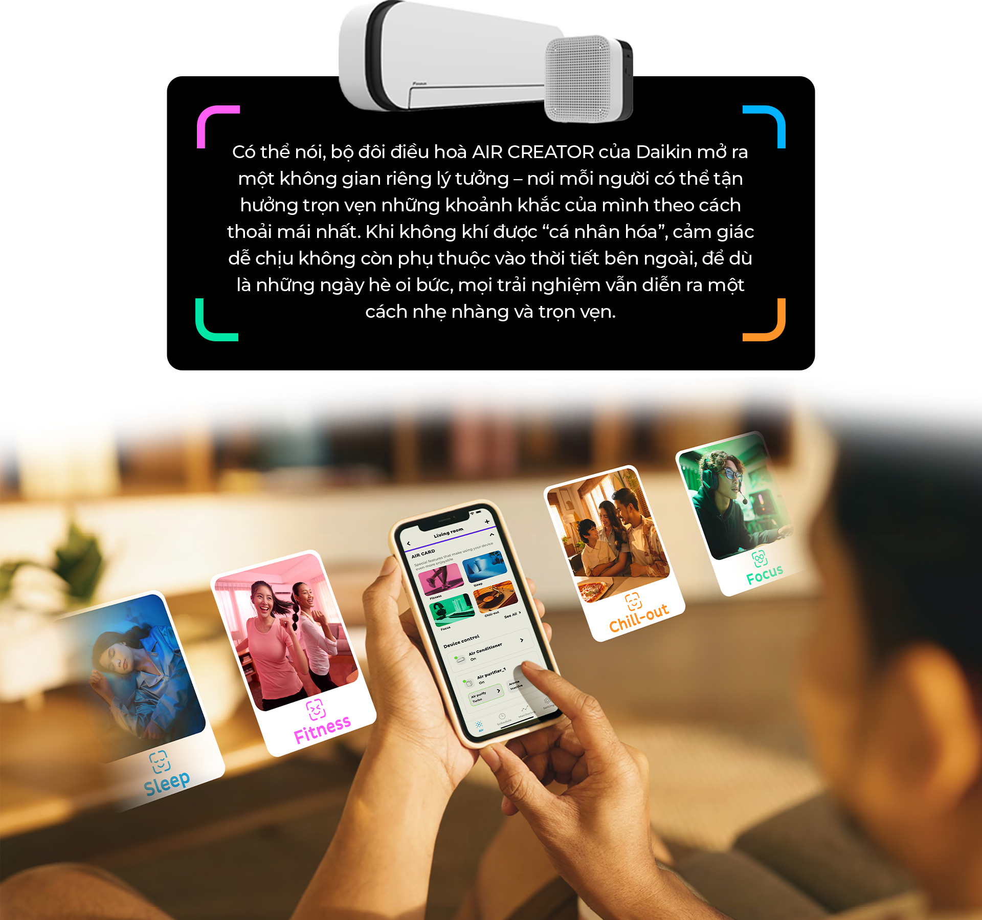 AIR CREATOR mang đến một trải nghiệm khác biệt: cá nhân hóa không khí theo từng nhu cầu sống. Mỗi người có thể tự tạo cho mình một "khí hậu riêng" - nơi mọi hoạt động từ làm việc, vận động đến nghỉ ngơi đều diễn ra trong trạng thái dễ chịu và tối ưu nhất, bất chấp nhiệt độ ngoài trời.