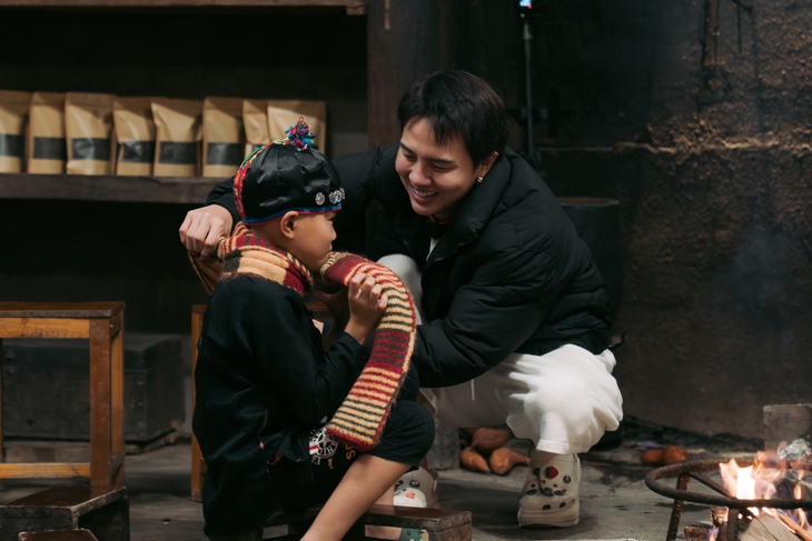 Bé Thắng hạnh phúc khi nhận được món quà là chiếc khăn choàng cổ của chú Duy Khánh. Cậu bé tình cảm òa khóc bởi sợ các cô chú trở về nhà - Ảnh: BTC