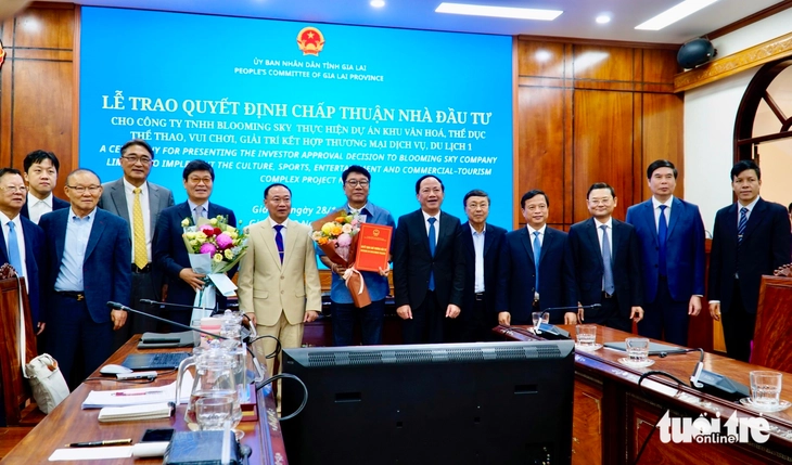 Lãnh đạo tỉnh Gia Lai trao quyết định chấp thuận nhà đầu tư cho một dự án lớn về văn hóa, thể thao của nhà đầu tư Hàn Quốc - Ảnh: TẤN LỰC