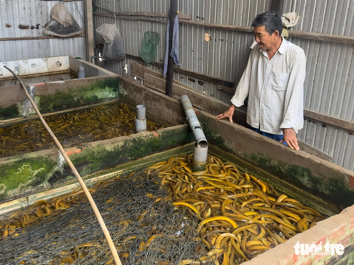 Ông Nguyễn Văn Mưa, ngụ xã Ngọc Chúc, tỉnh An Giang, bên bể lươn của gia đình, lo lắng khi giá lươn liên tục lao dốc - Ảnh: HOA ÁNH