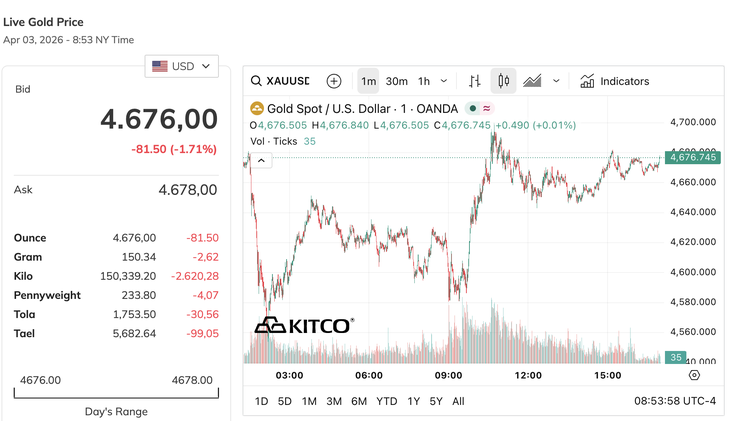 Trong nước, giá vàng miếng SJC bán ra ngày 3-4 giảm 1,5 triệu đồng/lượng, còn 174,5 triệu đồng/lượng, mua vào ở mức 171 triệu đồng/lượng