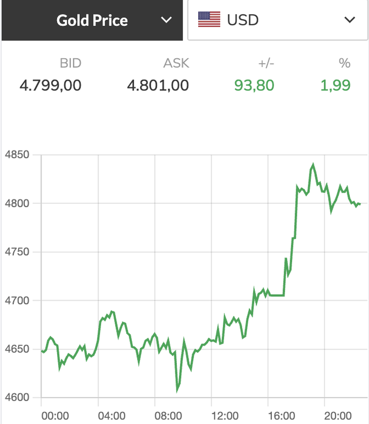 Giá vàng thế giới vượt 4.800 USD/ounce - Ảnh chụp màn hình