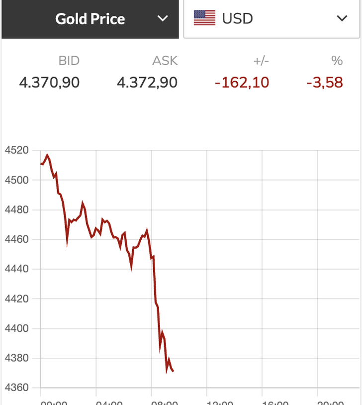 Tuy nhiên đà giảm chưa dừng lại. Lúc 21h50, giá vàng thế giới chỉ còn 4.374,6 USD/ounce, giảm 162 USD/ounce (tương đương 5,15 triệu đồng/lượng).