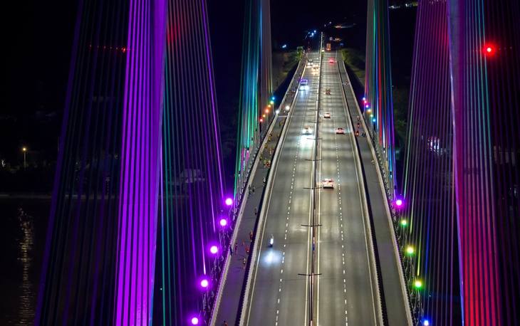 Các vận động viên chinh phục càu Cao Lãnh hùng vỹ bắc qua sông Tiền - Ảnh: NX