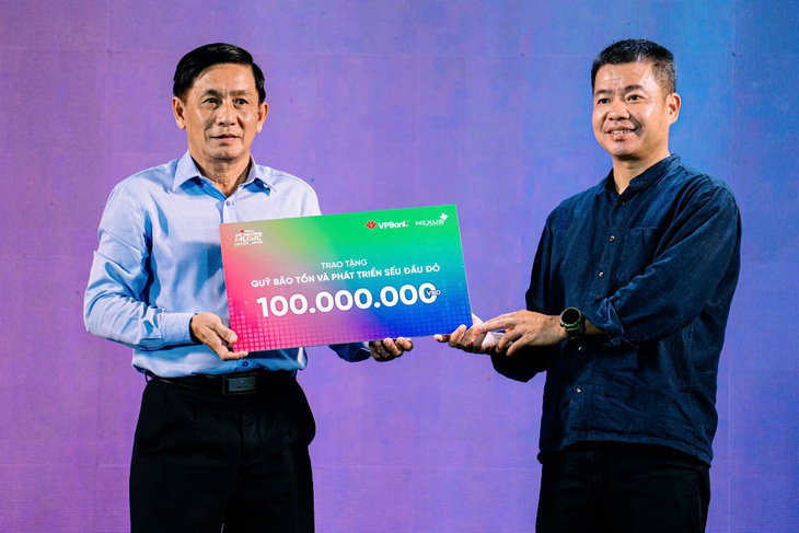 Đại diện Nexus Sport Event trao biểu trưng 100 triệu đồng cho đại diện Vườn quốc gia Tràm Chim nhằm đóng góp cho đề án Bảo tổn sếu đầu đỏ - Ảnh: THANH HIỆP