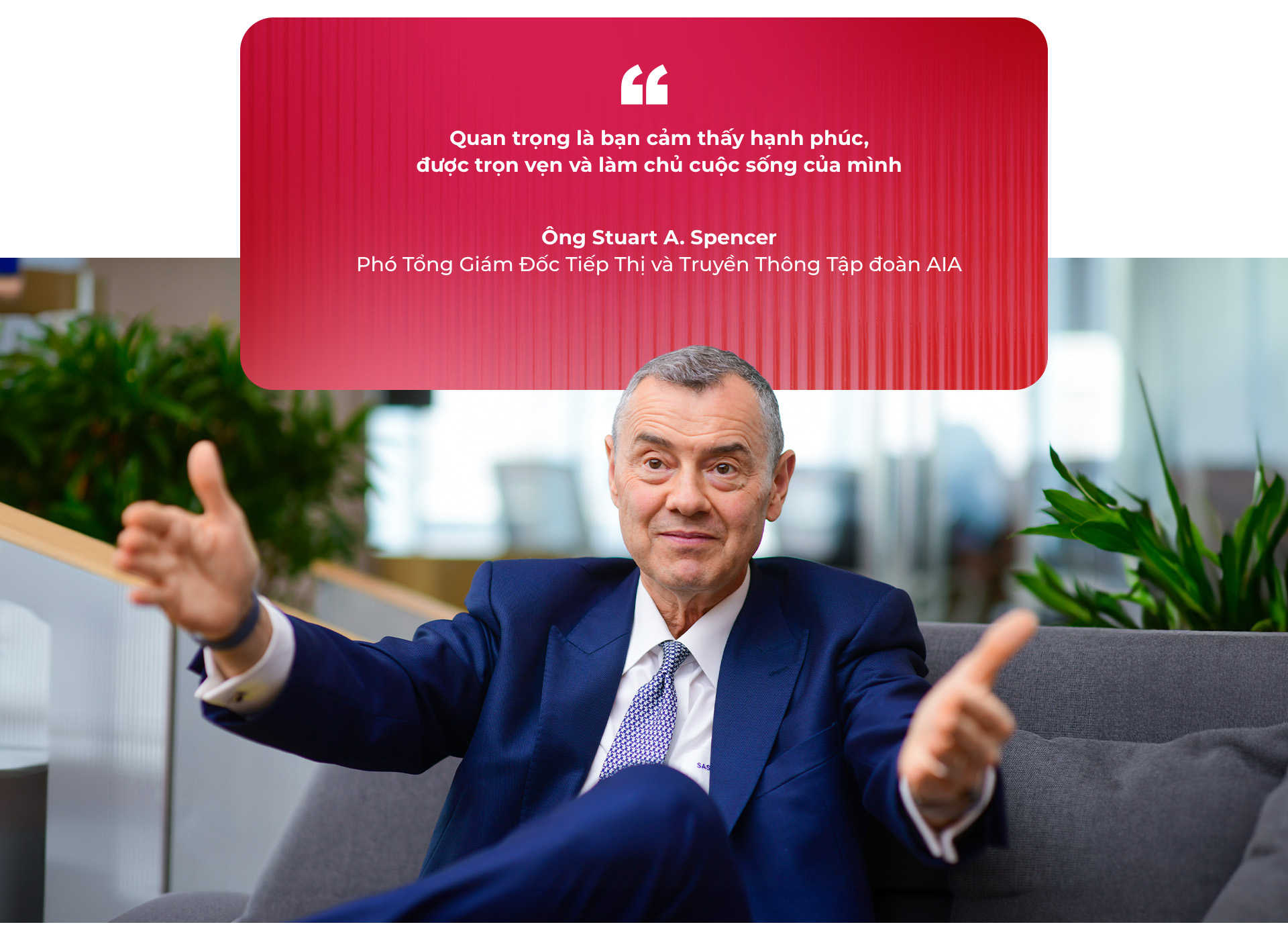 Chia sẻ với Tuổi Trẻ, ông Spencer cho biết chính cách tiếp cận toàn diện này đã định hình chiến lược phát triển của AIA tại Việt Nam cũng như trên toàn khu vực châu Á. Mục tiêu mà doanh nghiệp theo đuổi không chỉ dừng lại ở việc cung cấp các giải pháp bảo hiểm, mà còn là đồng hành cùng khách hàng trong hành trình "Sống Khỏe hơn, Lâu hơn, Hạnh phúc hơn".