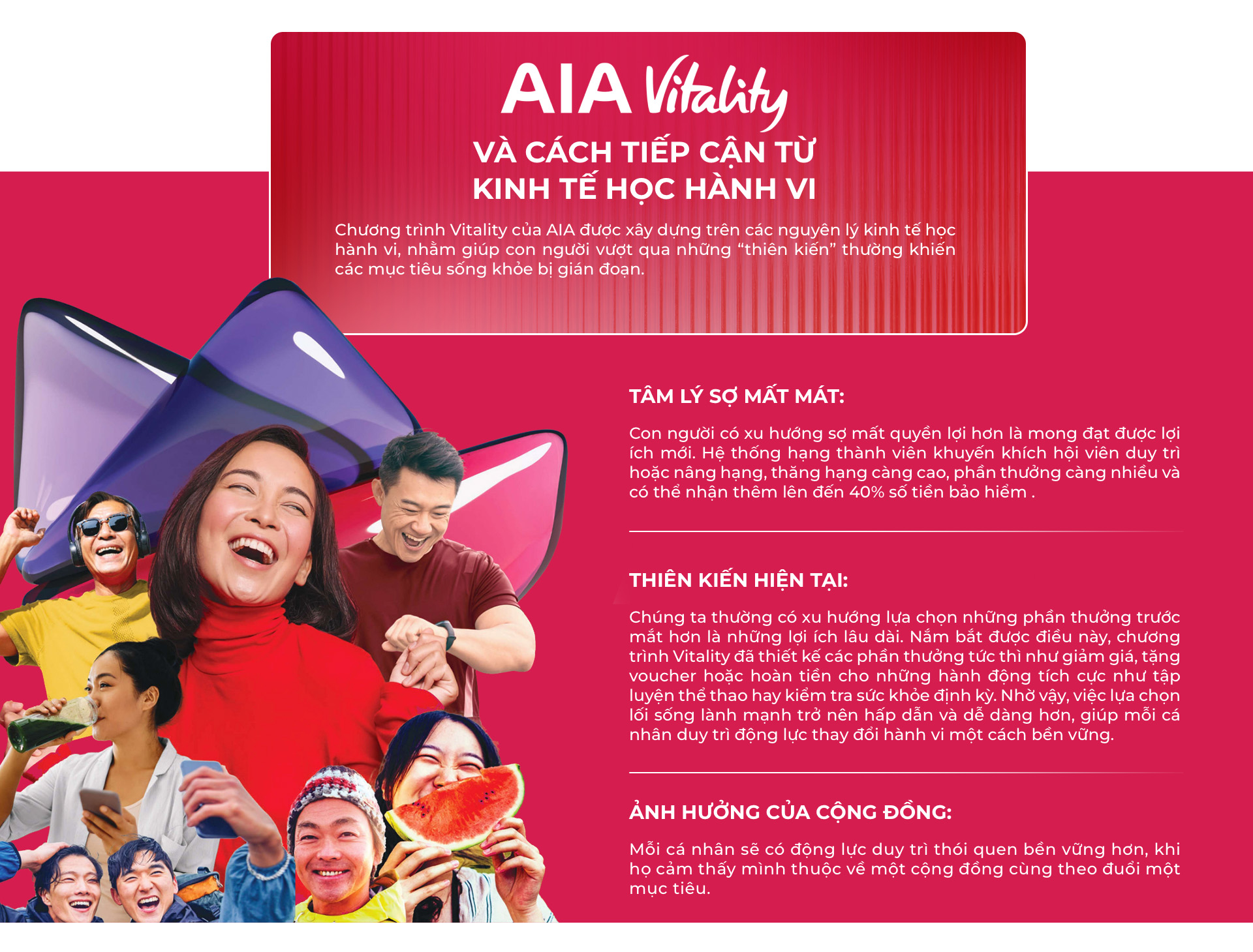 Để hiện thực hóa mục tiêu này, AIA phát triển một hệ sinh thái chăm sóc sức khỏe, với trọng tâm là chương trình AIA Vitality.