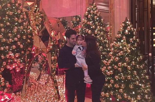 | Tiền vệ Cesc Fabregas chụp ảnh bên cây thông cùng bạn gái Daniella Semaan và con. Ảnh: Twitter |