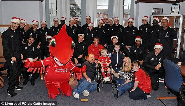 Toàn đội Liverpool đến thăm các bệnh nhân nghèo. Ảnh: Getty Images  | | Pha đội mũ Noel ăn mừng bàn thắng vui nhộn của Anthony Mounier. Ảnh: Daily Mail | |