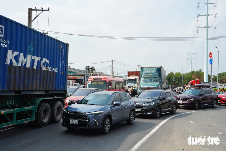 Hàng dài xe cộ chen chúc tại nút giao Phú Hữu - Ảnh: HỮU DUY