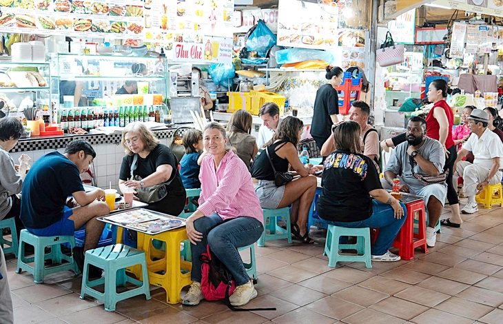 Du khách nước ngoài trải nghiệm ẩm thực đêm tại chợ Bến Thành - Ảnh: HỮU HẠNH