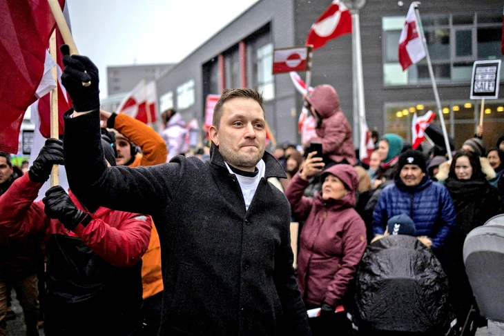 Thủ hiến Greenland Jens-Frederik Nielsen đi bộ cùng người dân trong một cuộc biểu tình phản đối yêu cầu của Tổng thống Mỹ Donald Trump về việc nhượng lại hòn đảo cho Mỹ, đồng thời kêu gọi quyền tự quyết cho tương lai của hòn đảo, tại Nuuk, Greenland ngày 17-1 - Ảnh: REUTERS