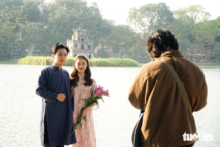 Người dân Hà Nội chụp ảnh bên hồ Gươm - Ảnh: NGUYỄN HIỀN