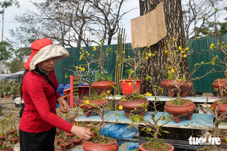 Chị Đỗ Thị Oanh (quê Hưng Yên) lo lắng bên dãy mai vàng còn tồn đọng, dù đã hạ giá còn 100.000 đồng/2 cây nhưng vẫn kén khách - Ảnh: PHÚC TÀI