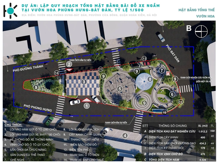 UBND phường Hoàn Kiếm vừa phê duyệt quy hoạch tỉ lệ 1/500 bãi đỗ xe ngầm vị trí tại vườn hoa Phùng Hưng - Bát Đàn.