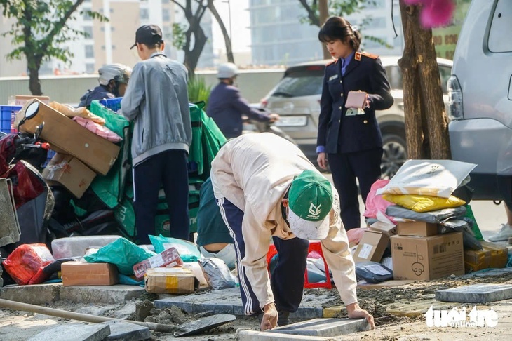Công nhân lát đá vỉa hè tại Hà Nội - Ảnh: PHẠM TUẤN