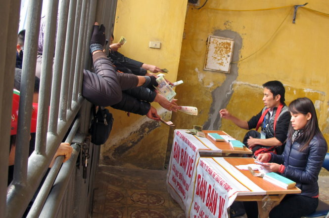 | Những cánh tay chìa ra trong phòng vé. Ảnh: Đức Bình |