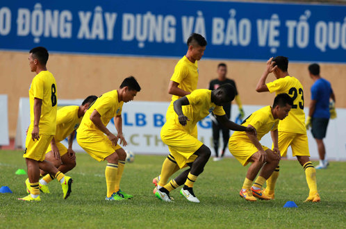 | Các cầu thủ Thanh Hóa khởi động trước trận đấu. Ảnh: Nam Khánh |