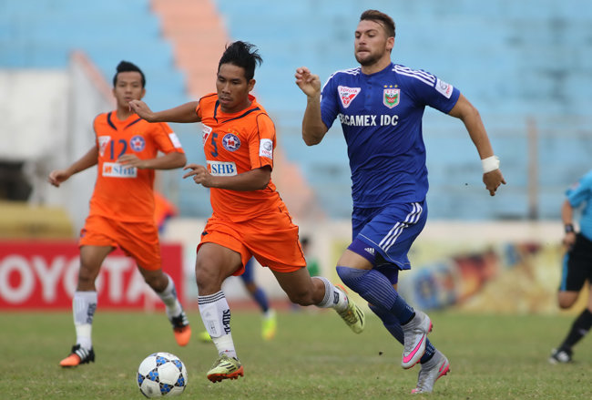 | Trong hiệp một Becamex Bình Dương (xanh) lấn lướt hoàn toàn SHB Đà Nẵng (xanh). Ảnh: HẢI NAM |