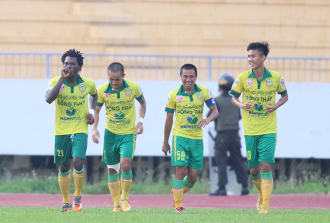 | Niềm vui của các cầu thủ Đồng Tháp sau khi mở tỉ số. Ảnh: N.K |