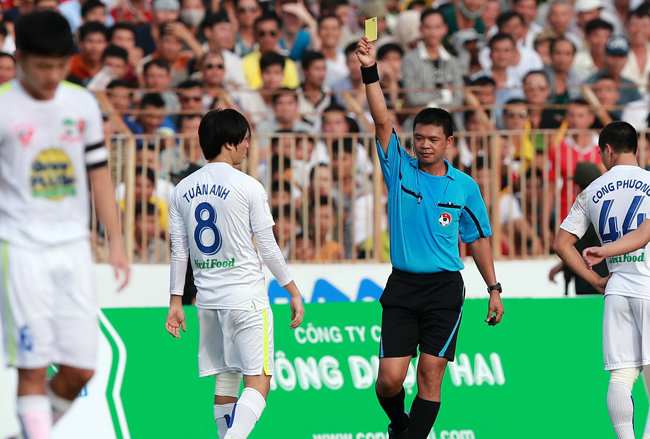 | Tiền vệ Tuấn Anh nhận thẻ vàng. Ảnh: Nam Khánh |