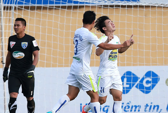 | Niềm vui của Minh Vương (phải) sau khi mở tỉ số cho HAGL. Ảnh: Nam Khánh |