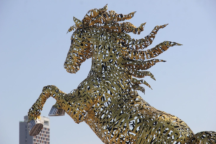 Linh vật Kim Mã Hợp Nhất mang trên mình tên 94 xã, phường, đặc khu của thành phố mới, được trưng bày trước Bảo tàng Đà Nẵng.