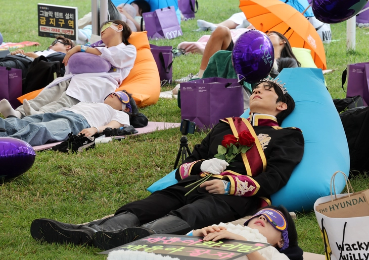Một người tham gia hóa trang thành hoàng tử ngủ trưa trong Cuộc thi ngủ trưa Hangang 2025 tại công viên Yeouido Hangang ở thủ đô Seoul (Hàn Quốc) ngày 20-4-2025 - Ảnh: NEWSIS
