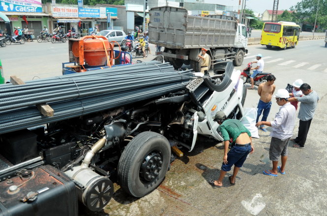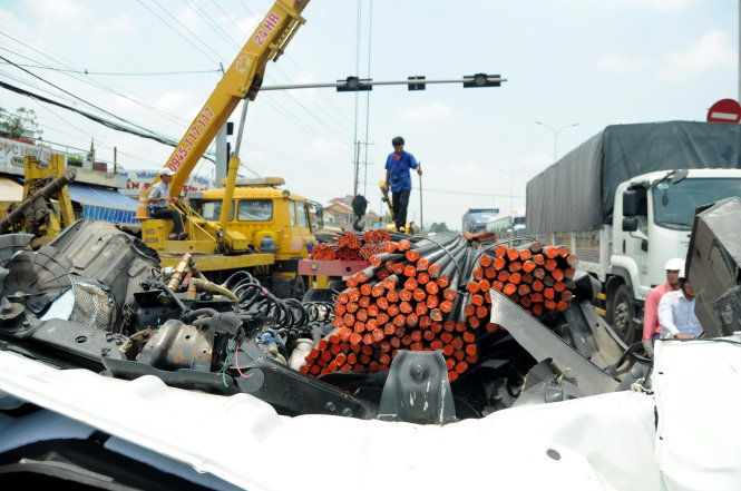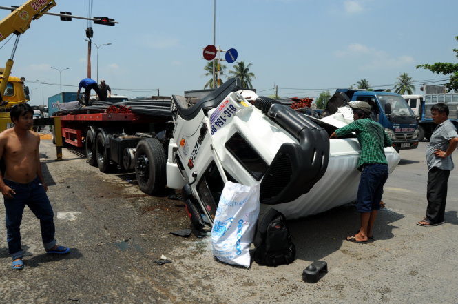 Khi đến ngã 3 Tân Cang thì bất ngờ một xe ba gác vượt đèn đỏ băng qua đường khiến tài xế phải thắng gấp. Cú thắng bất chợt khiến cho 10 bó sắt phía sau trượt tới trước đập mạnh vào phía sau cabin xe đầu kéo rồi đẩy cabin tới trước giộng mạnh xuống mặt đường, các bó sắt đè lên cabin.