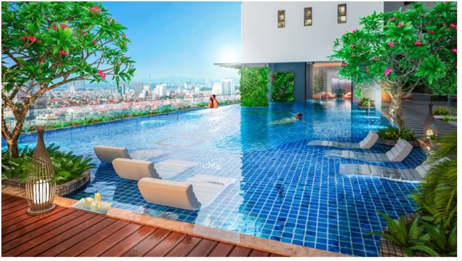 | Hồ bơi The Park Avenue sử dụng tối đa mảng xanh trong thiết kế, mang lại không gian xanh mát, trong lành. |