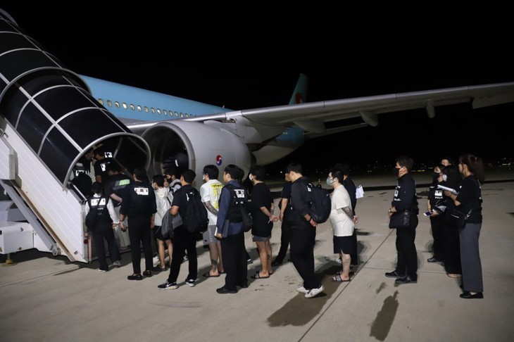 Các công dân Hàn Quốc liên quan hoạt động lừa đảo sử dụng công nghệ được bàn giao tại sân bay quốc tế ở thủ đô Phnom Penh, Vương quốc Campuchia, tối 17-10-2025 - Ảnh: AKP/TTXVN