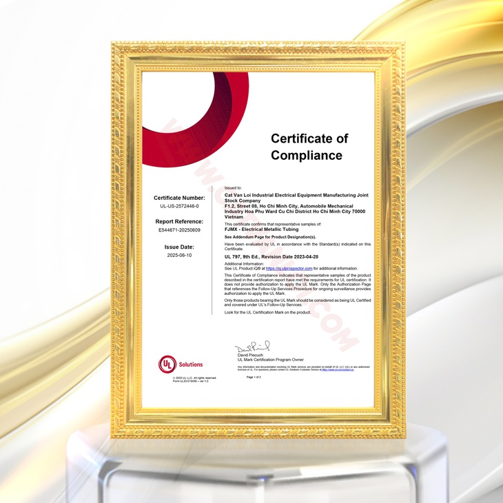 Sau nhiều năm nỗ lực cùng với nhiều thử thách và áp lực, những sản phẩm của Cát Vạn Lợi đã chính thức được cấp chứng nhận UL Listed cho ống thép luồn dây điện EMT và máng cáp lưới.