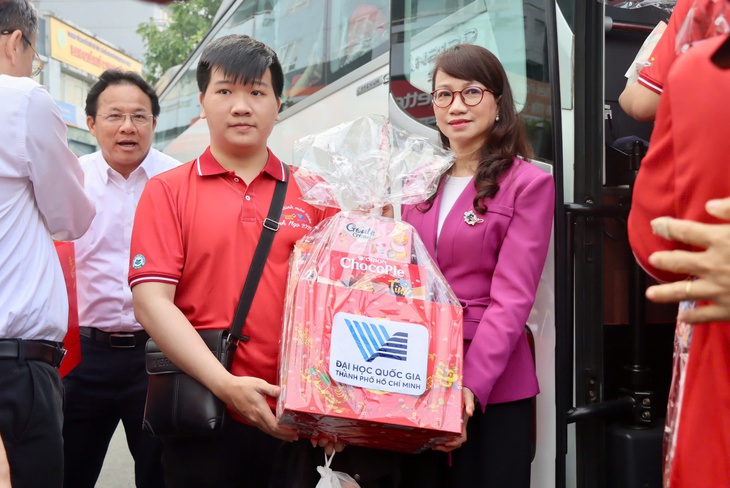 Giám đốc Đại học Quốc gia TP.HCM, GS.TS Nguyễn Thị Thanh Mai trao quà Tết cho sinh viên lên xe về quê đón Tết - Ảnh: LÊ HUY