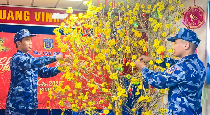 Tại phòng Hồ Chí Minh - nơi cán bộ, chiến sĩ trên tàu gọi là "tâm hồn" của những ngày trực Tết trên biển, công việc trang trí đón xuân ở đây được mọi người chuẩn bị chu đáo và trang nghiêm với bánh mứt, trái cây và những chậu quất, cành mai mang ra từ đất liền.