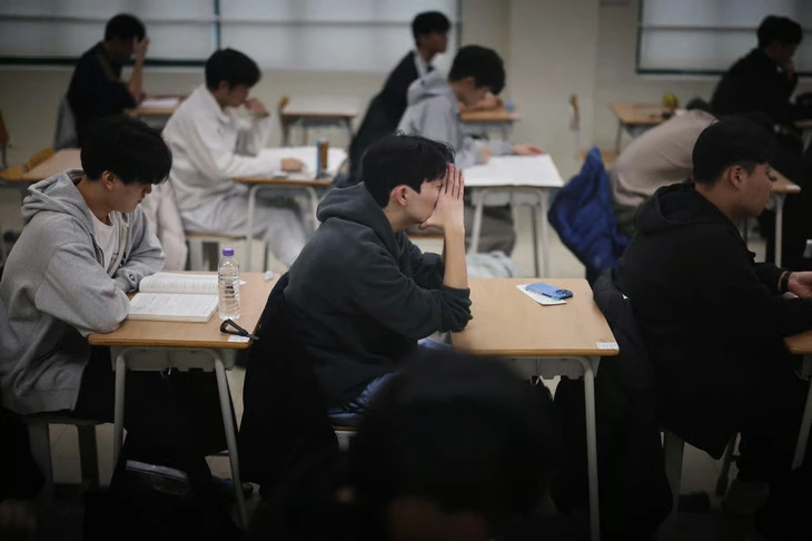 Học sinh Hàn Quốc chờ đợi bắt đầu kỳ thi tuyển sinh đại học thường niên tại Seoul - Ảnh: AFP
