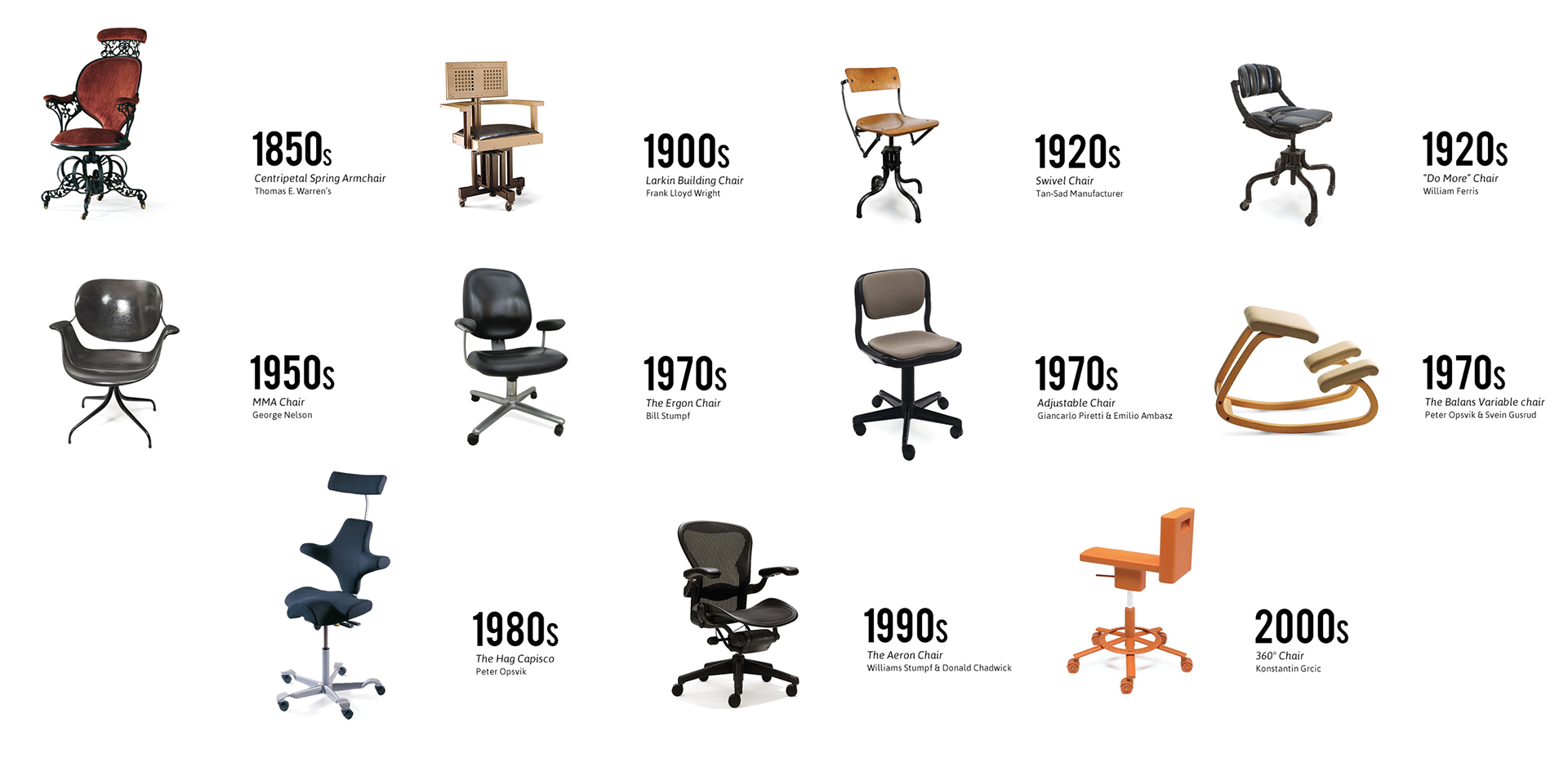 Những chiếc ghế văn phòng công thái học đầu tiên được sản xuất đại trà năm 1970 - nổi bật nhất là Ergon Chair, chiếc ghế đã trở thành tiêu chuẩn của không gian văn phòng, được Wiiliam Stumpf thiết kế cho công ty nội thất Herman Miller năm 1976.