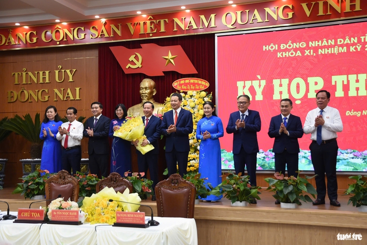 Ông Vũ Hồng Văn - Ủy viên Trung ương Đảng, Bí thư Tỉnh ủy Đồng Nai - trao hoa chúc mừng Chủ tịch UBND tỉnh Đồng Nai Nguyễn Văn Út và chúc mừng các đại biểu tái đắc cử - Ảnh: A LỘC