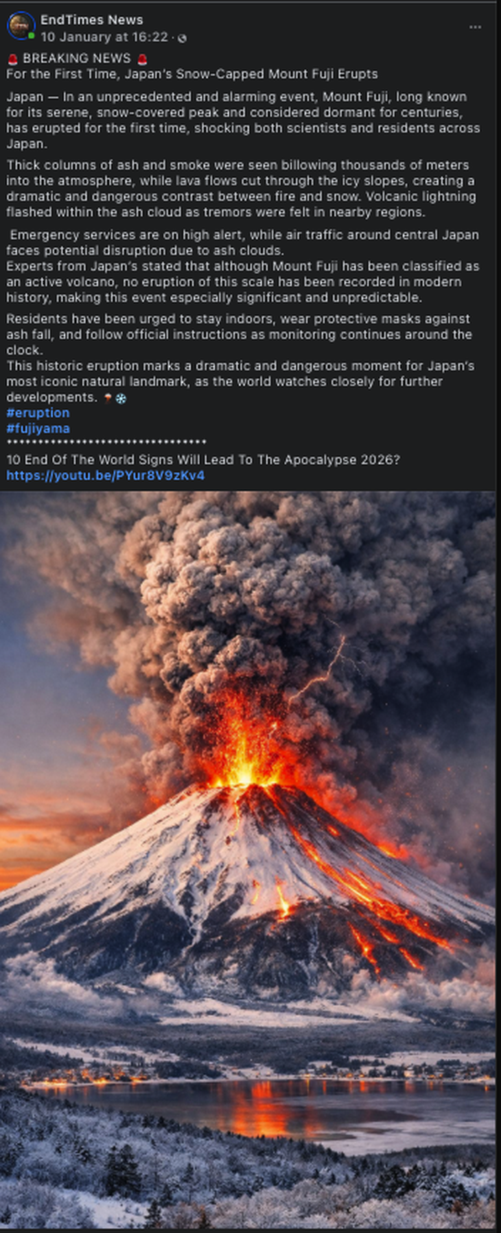 Giữa tháng 1, mạng xã hội Facebook lan truyền một bài đăng từ trang có tên "EndTimes News", kèm hình ảnh núi Phú Sĩ phủ tuyết với dòng dung nham chảy xuống sườn núi và cột tro bụi dày đặc bốc lên không trung.